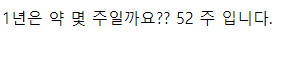 | 1 2 3 4 5 6 7 8 9 10 11 12 13 14 15 | <%@ page language="java" contentType="text/html; charset=EUC-KR"     pageEncoding="EUC-KR"%> <!DOCTYPE html> <html> <head> <meta charset="EUC-KR"> <title>Insert title here</title> </head> <body>     <% int year=365; %>     <% out.println("1년은 약 몇 주일까요??"); %>     <%= year/7 %>     <%= " 주 입니다." %> </body> </html> | cs |