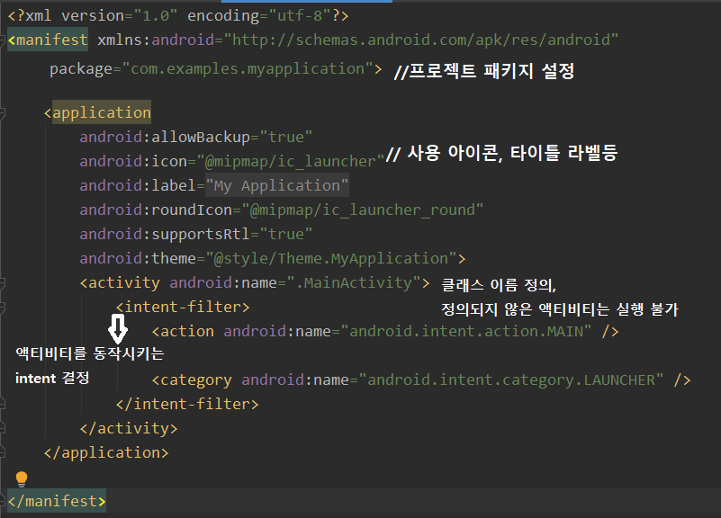 ✓ AndroidManifest.xml - 애플리케이션 수행에 필요한 필수 정보