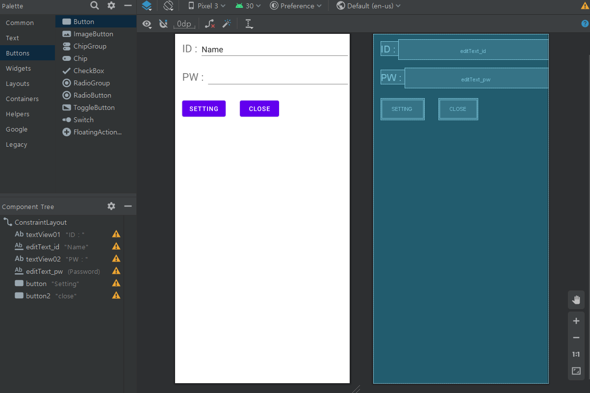 textView 2개와 editText 1개 그리고 패스워드를 받을 부분은 editText의 Password 형태 그리고 마지막으로 버튼 2개로 SETTING 버튼과 CLOSE 버튼으로 레이아웃을 구성하였다.