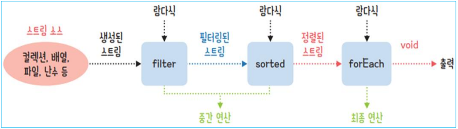 ✓ 스트림 연산의 결과가 Stream 타입이면 연속적으로 호출 가능