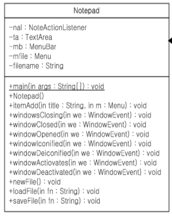 | public Notepad() | 메모장에 필요한 SWING 컴포넌트를 생성하고 배치 |