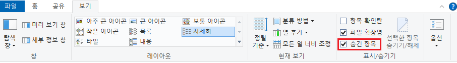 파일 탐색기에서 다음과 같이 보기 탭에 있는 숨긴 항목을 체크해주시면 숨겨진 폴더들을 볼 수 있습니다.