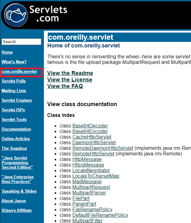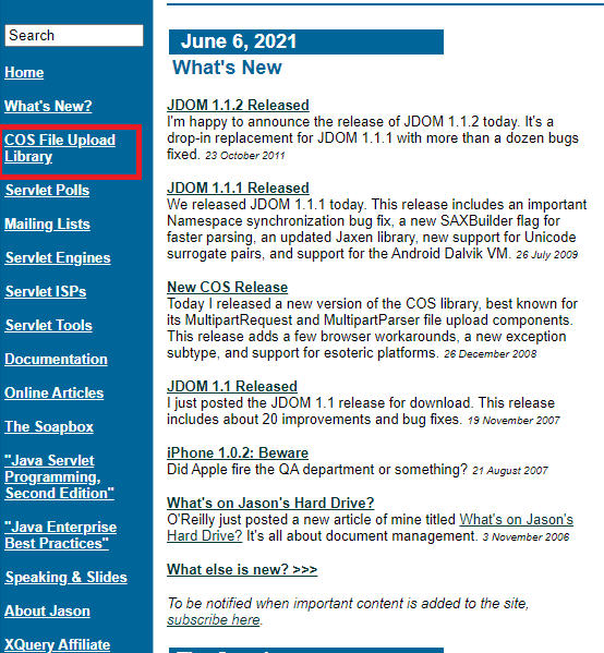 Home What's New? COS File Upload Library Servlet Polls Mailing Lists Servlet Engines Servlet ISPs Servlet Tools Documentation Online Articles The Soapbox "Java Servlet Programming, Second Edition" "Java Enterprise Best Practices" Speaking & Slides About Ja
