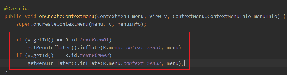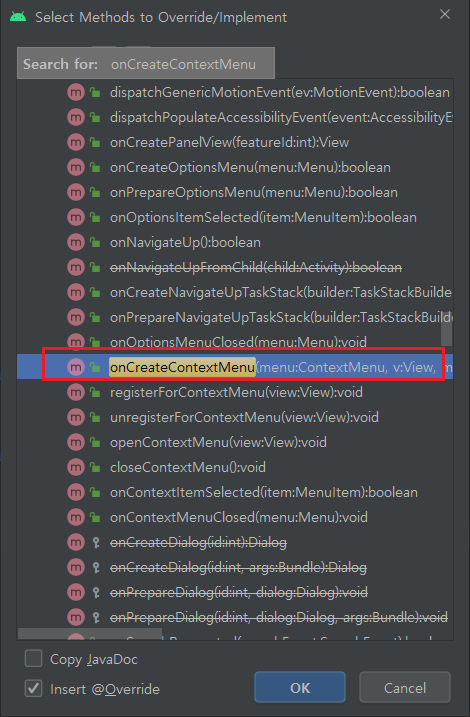 Ctrl + O를 눌러 onCreateContextMenu 메서드를 @Override 해줍니다.