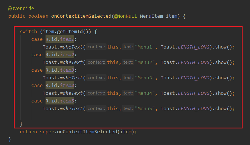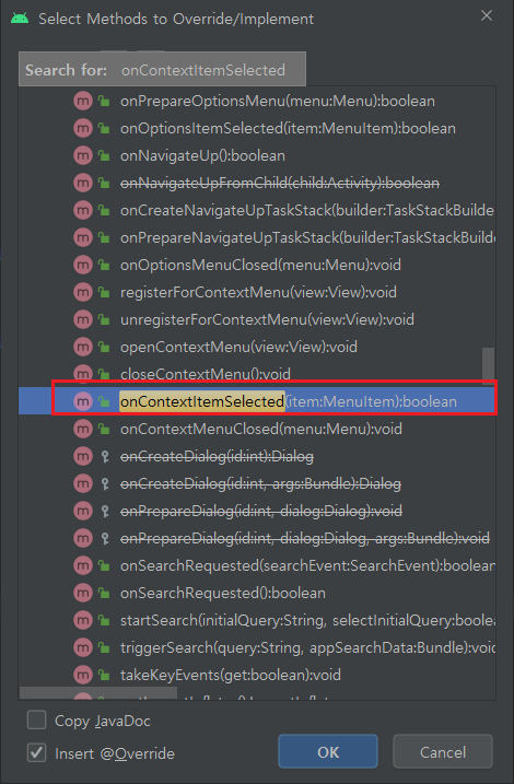 Ctrl + O를 눌러 onContextItemSelected 메서드를 @Override 해줍니다.