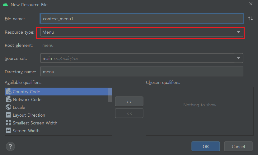 리소스 생성에서 Resource type을 Menu로 두고 xml파일을 생성합니다.